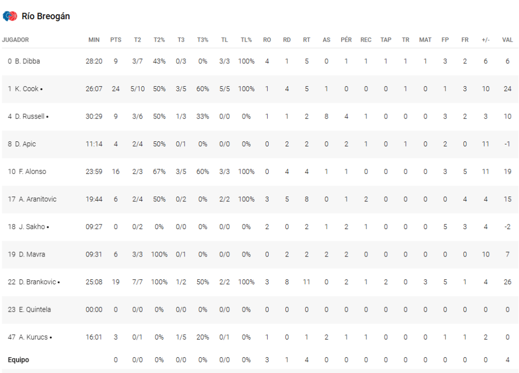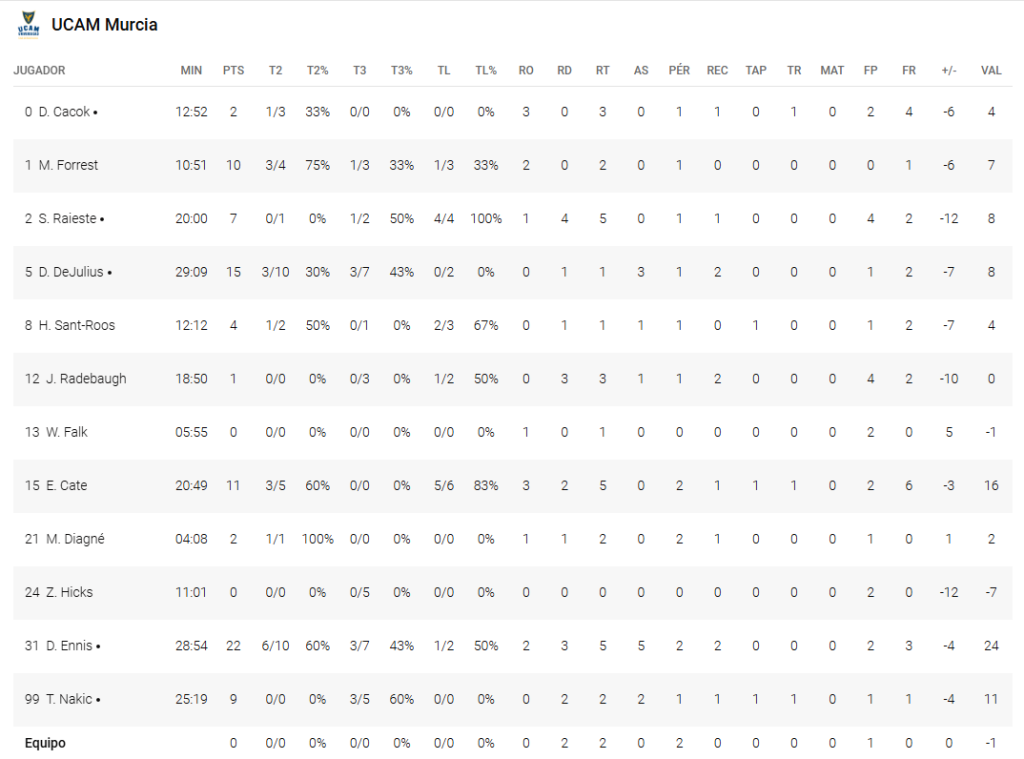 - Figuras en estado de gracia: Mientras el UCAM pareció depender en exceso de Ennis y Raieste, el Breogán presentó un equipo lleno de armas. Tyler Cook fue imparable en ataque (24 puntos y 5 asistencias), Brankovic confirmó su explosión y rentabilidad en el juego interior, y Alonso aportó 16 puntos clave. Además, Jordan Russell, mejorado, fue esencial en el control del ritmo del partido.