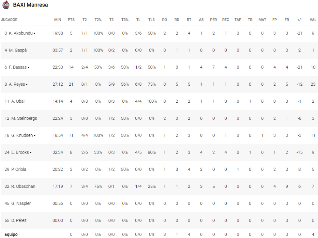 78 – Baxi Manresa (26+17+20+15): Bassas (14), Brooks (8), Reyes (21), Knudsen (11), Akobundu (5) -cinco inicial-; Oriola (3), Ubal (4), Steinbergs (3), Gaspá (2) y Obasohan (7).
