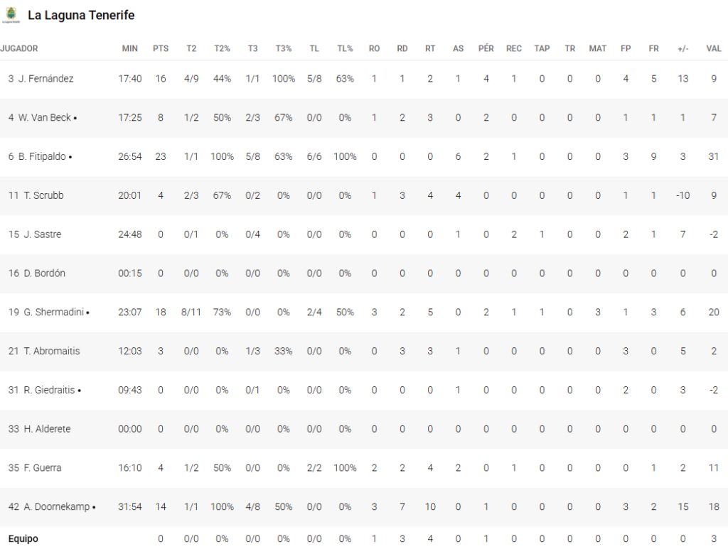 - 90 – La Laguna Tenerife (23+22+23+22): Van Beck (8), Fitipaldo (23), Shermadini (18), Giedraitis (0) y Doornekamp (14) -quinteto titular-; Fernández (16), Scrubb (4), Sastre (0), Abromaitis (3) y Guerra (4) .