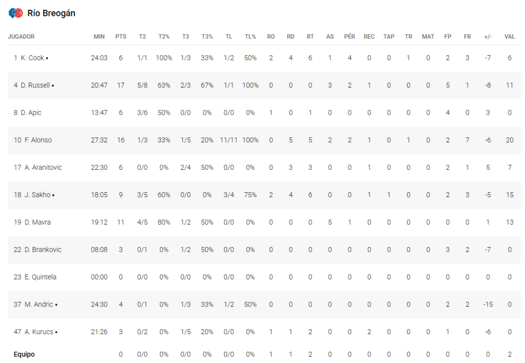 - 81 – Río Breogán (18+27+16+20): Cook (6), Russell (17), Sakho (9), Andric (4) y Kurucs (3) -quinteto titular-; Apic (6), Alonso (16), Aranitovic (6), Mavra (11) y Brankovic (3) .